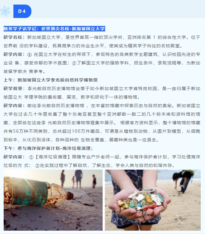 深入探秘新加坡丰富多彩的生态环境,从新生水厂、自然历史博物馆、海洋保育,带领学员走进自然,学习环保知识,探索全球最大海洋世界,从小树立环保意识。