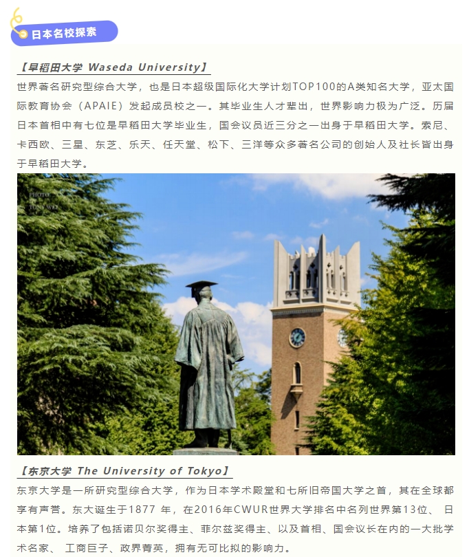 随后前往早稻田大学*学子导览1小时,早稻田大学是一所研究型综合大学,也是日本超级国际化大学计划TOP100 的A类知名大学,亚太国际教育协会(APAIE)发起成员校之一。