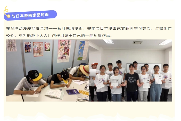 这一环节,我们安排了秋叶原动漫街以及与日本漫画家零距离学子漫画的激动人心的体验!相信通过深入日本动漫文化街以及动漫大师的手把手指导,你就是名合格的动漫达人啦!
