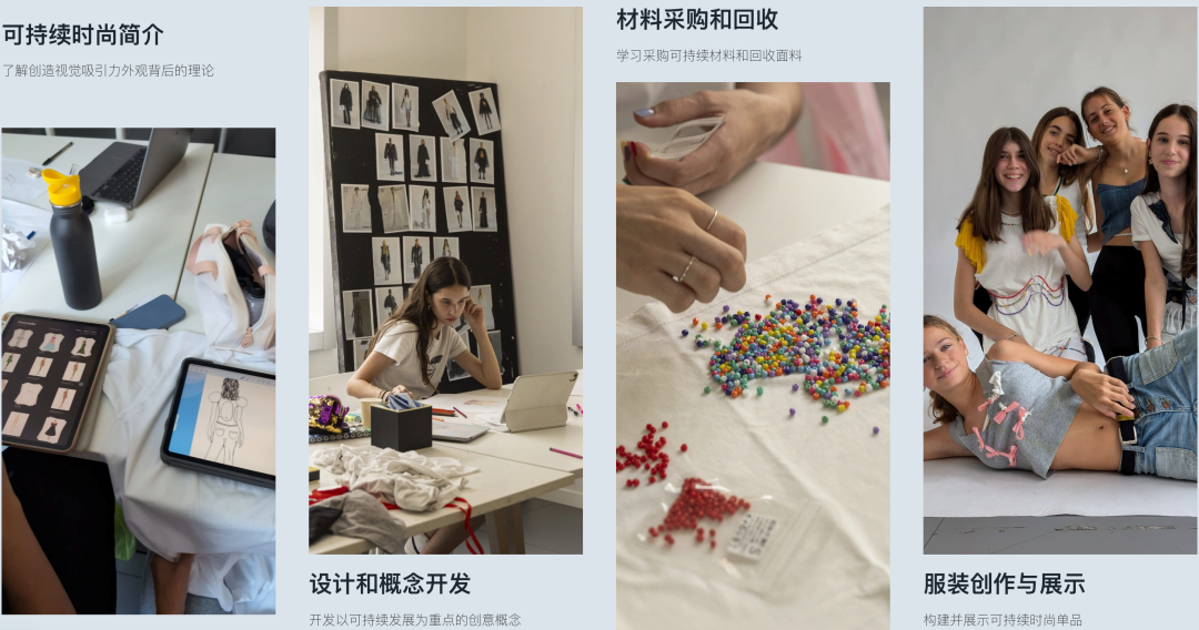 可持续时尚概念:学生将学习如何开发以可持续发展为核心的时尚创意概念,了解可持续时尚的相关文化背景和理念,从设计初期就将环保元素融入其中。