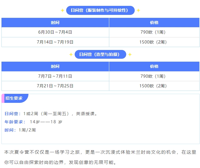 本次夏令营不仅仅是一场学习之旅,更是一次沉浸式体验米兰时尚文化的机会,在这里你可以自由探索时尚的边界,发现创意的无限可能。