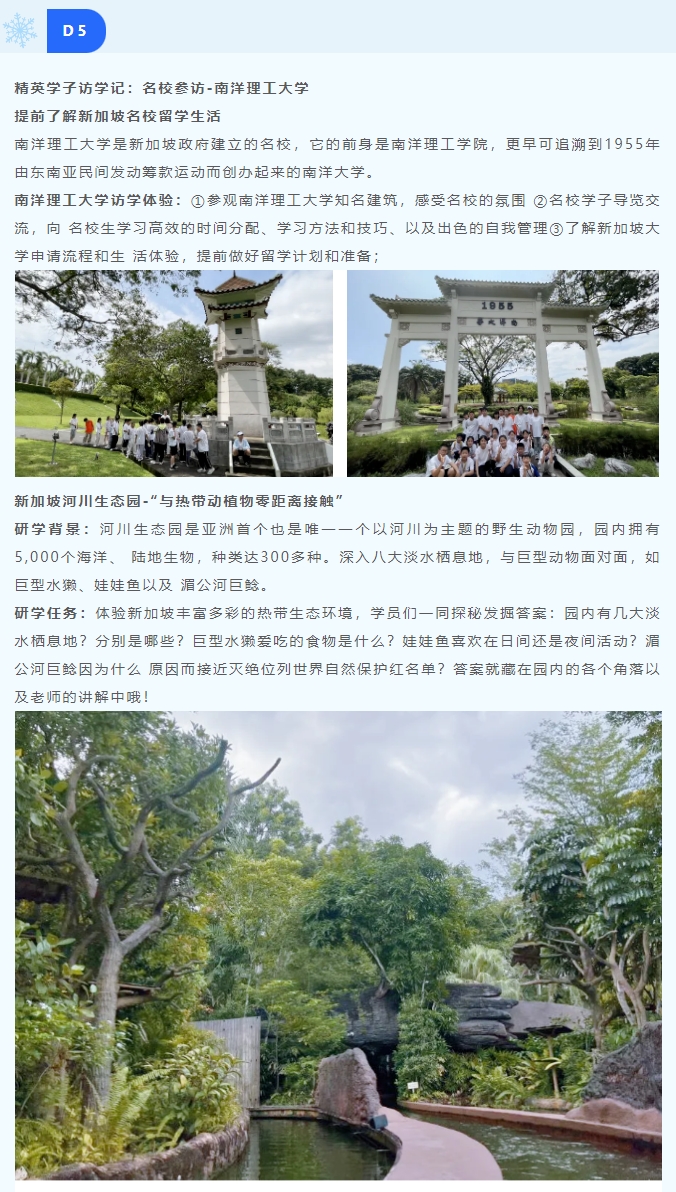 我们带领学员们走进新加坡国立大学和南洋理工大学,了解名校发展历史、熟悉校园环境,聆听榜样的学习经历;